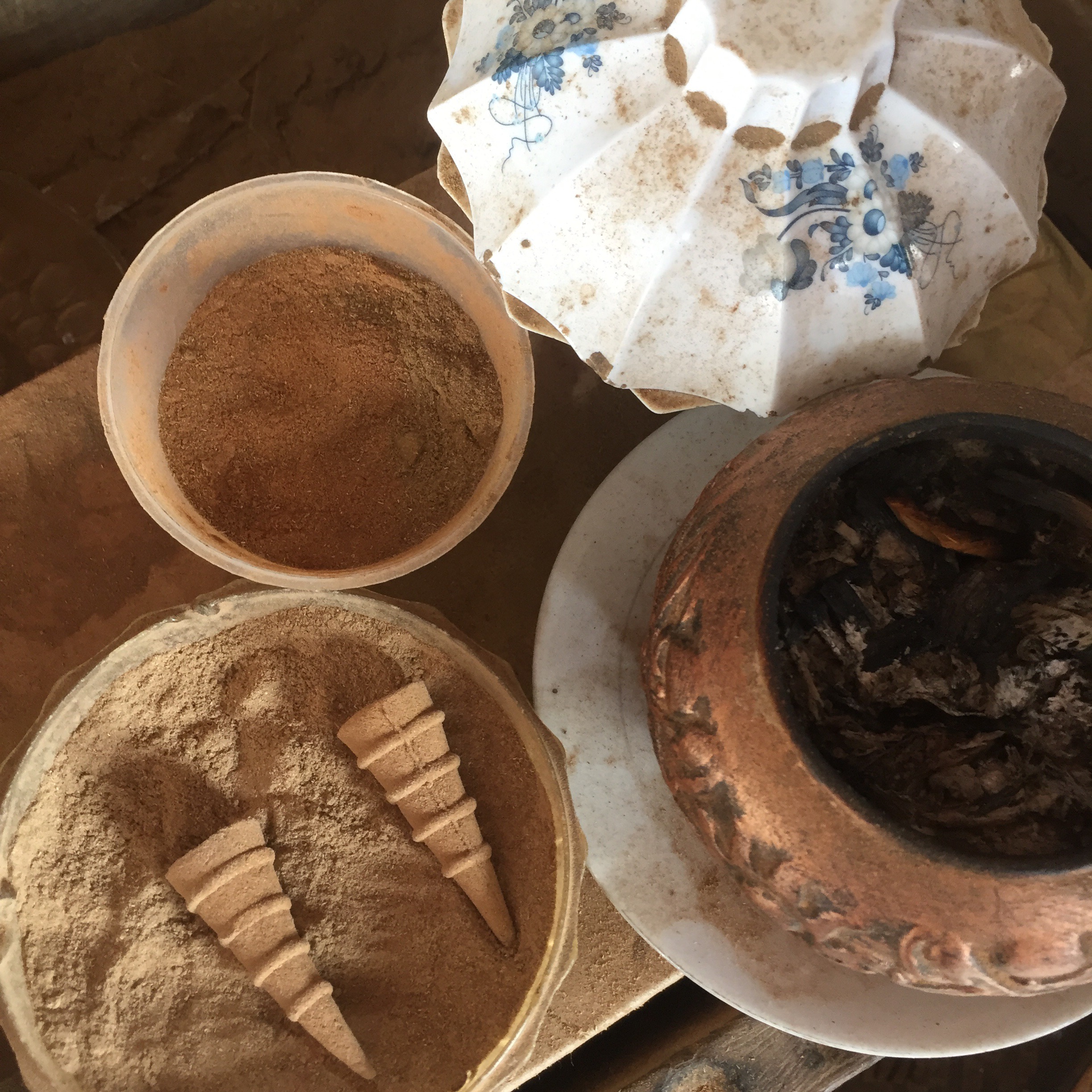 The raw ingredients are lemongrass, sandalwood and cinnamon. Cinnamon is the main ingredient in the paste that is rolled onto the bamboo sticks (it’s mixed with water to form that going mud-like paste)