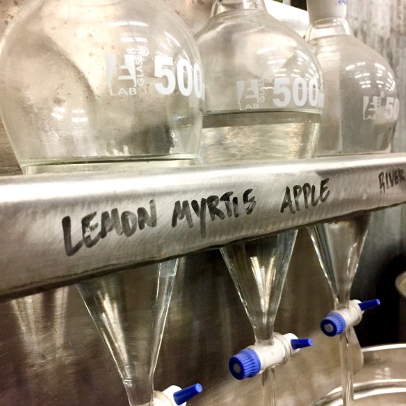 Ben likened the blending of gin and the individual distillates to perfumery. I had already seen the signs when I first walked in to the distillery. What really peaked my interest, was the wall of glass measuring equipment housing single botanical distillates. Ooooooooooo …… glass beakers and botanicals!!!
